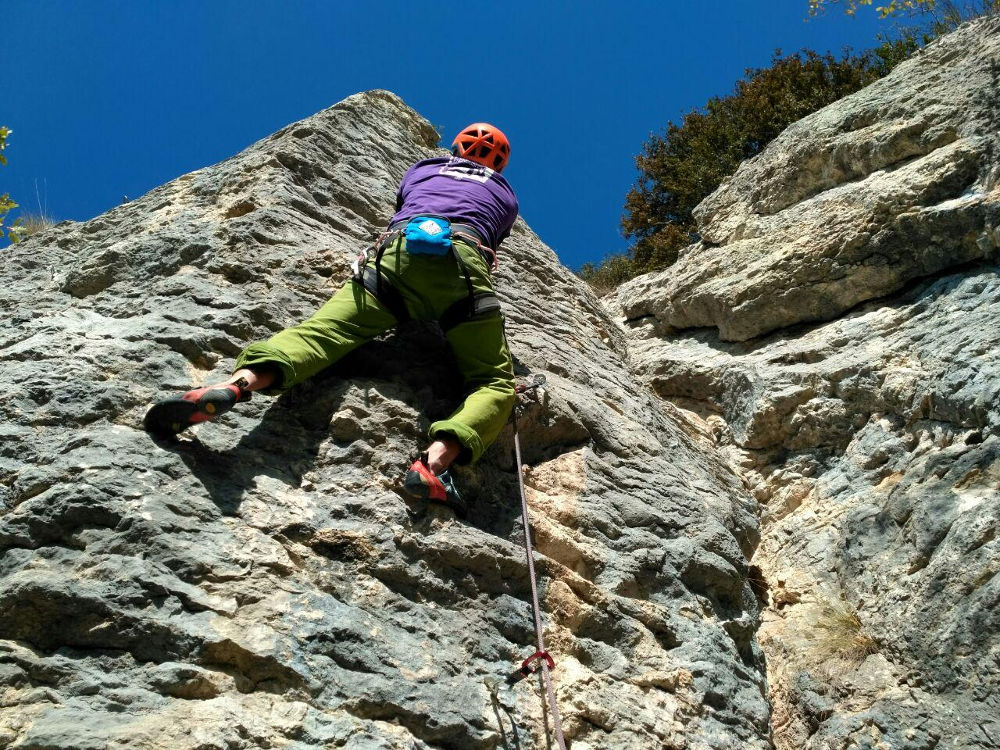 Després hem anat a Mammut Mut (V+), que jo ja havia fet la primera vegada que havia vingut. És molt guapa, amb uns passos atlètics per superar el desplom: la clau és anar a buscar una pedra lateral bona. Després del desplomet, una placa disfrutona i, més amunt, una aresta molt disfrutona. Una via molt guapa!